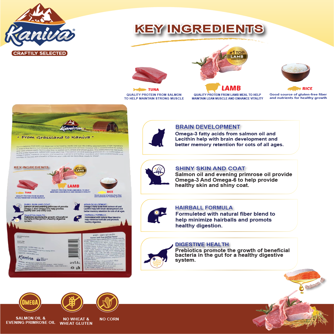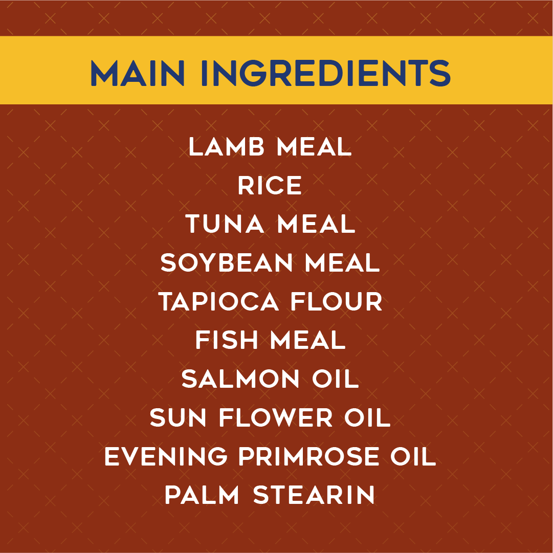 Lamb meal, rice, soybean meal, poultry meal, tapioca flour, tallow, fish meal, tuna meal, digested animal protein, sunflower oil, edible fiber (cellulose), salmon oil, essential vitamins (A, D3, E, C, nicotinic acid, B1, B6, pantothenic acid, B2, K3, folic acid, biotin, B12), essential trace minerals (iron, zinc, copper, manganese, iodine, selenium), choline chloride, canola oil, psyllium seed husk, whole egg powder, salt, dicalcium phosphate, lecithin, taurine, L-lysine, mannan oligosaccharide, methionine, evening primrose oil, enzyme, preservative (propionic acid), hydrated sodium calcium aluminosilicate, esterified glucomannan, shark cartilage powder, yucca schidigera extract.