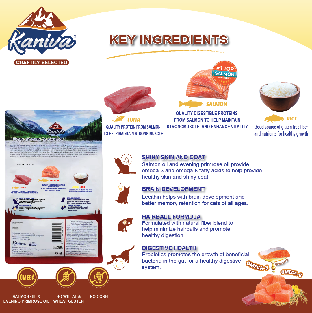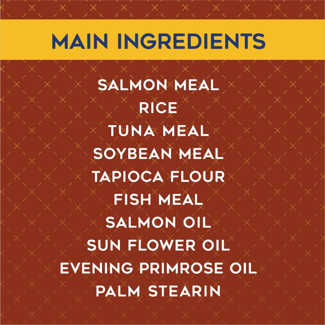 Salmon hydrolysate; rice; soybean meal; poultry meal; tapioca flour; tallow; fish meal; tuna meal; digested animal protein; sunflower oil; edible fiber (cellulose); salmon oil; essential vitamin supplements (A, D3, E, C, nicotinic acid, B1, B6, pantothenic acid, B2, K3, folic acid, biotin, B12); essential trace minerals (iron, zinc, copper, manganese, iodine, selenium); canola oil; whole egg powder; choline chloride; psyllium seed husk; salt; methionine; lecithin; taurine; dicalcium phosphate; L-lysine; mannan oligosaccharide; L-tyrosine; evening primrose oil; enzyme; preservative (propionic acid); hydrated sodium calcium aluminum silicate; esterified glucomannan; shark cartilage powder; yucca schidigera extract.